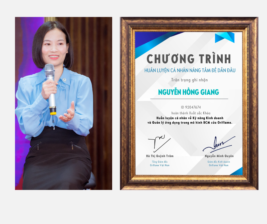 Chứng chỉ được cấp bởi Oriflame Việt Nam, được xác nhận bởi hai giám đốc điều hành cấp cao trong lĩnh vực kinh doanh và huấn luyện phát triển cá nhân.